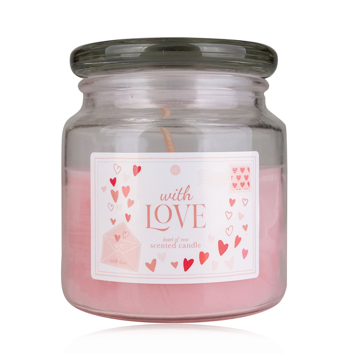 Vonná svíčka ve skle s motivem srdíček provoní váš domov příjemnou vůní růží.