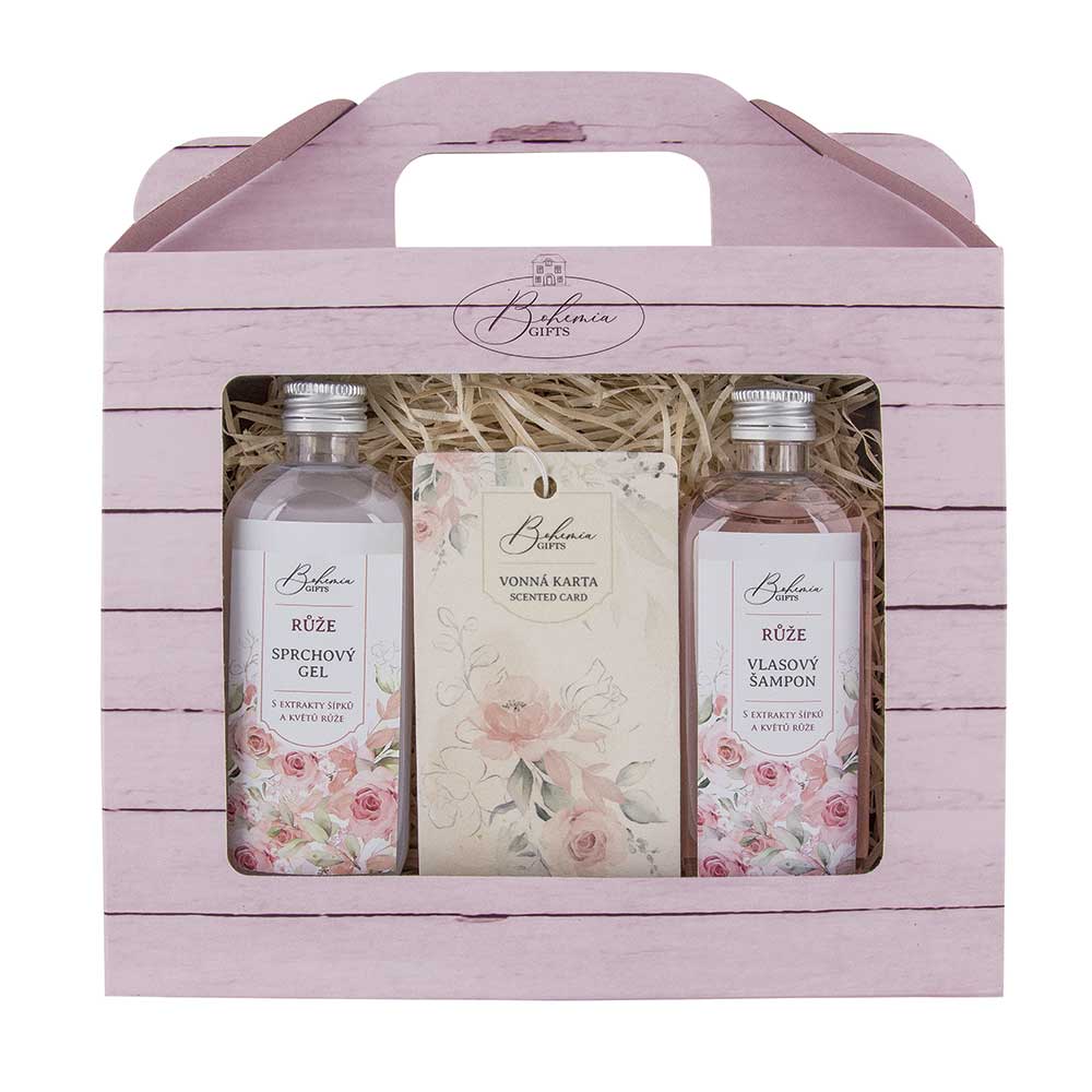 Sada obsahuje: Sprchový gel s extrakty z šípků a květů růže 100 ml Vlasový šampon s extrakty z šípků a květů růže 100 ml Ručně parfémovaná aromatická karta s vůní růže