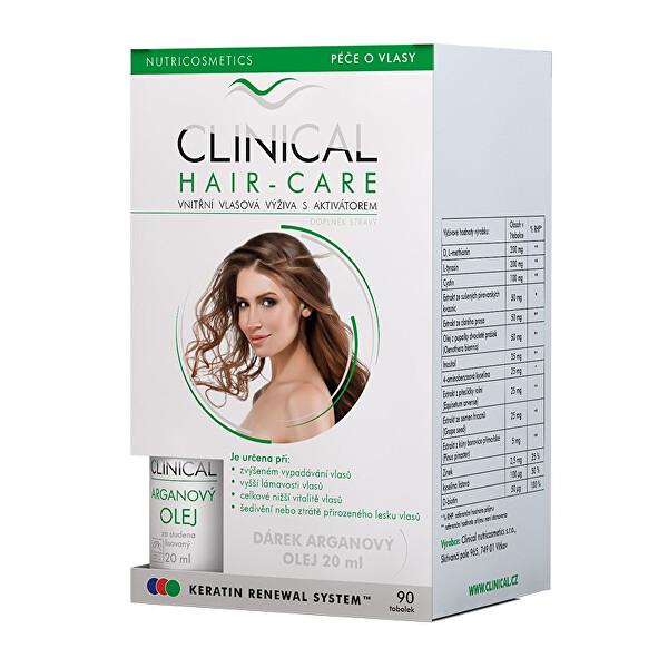 Clinical Hair-care je doplněk stravy obsahující vysoce účinný Keratin Renewal SystemTM, který stimuluje vlasové buňky k tvorbě kvalitního keratinu, nezbytného pro pevný vlas.