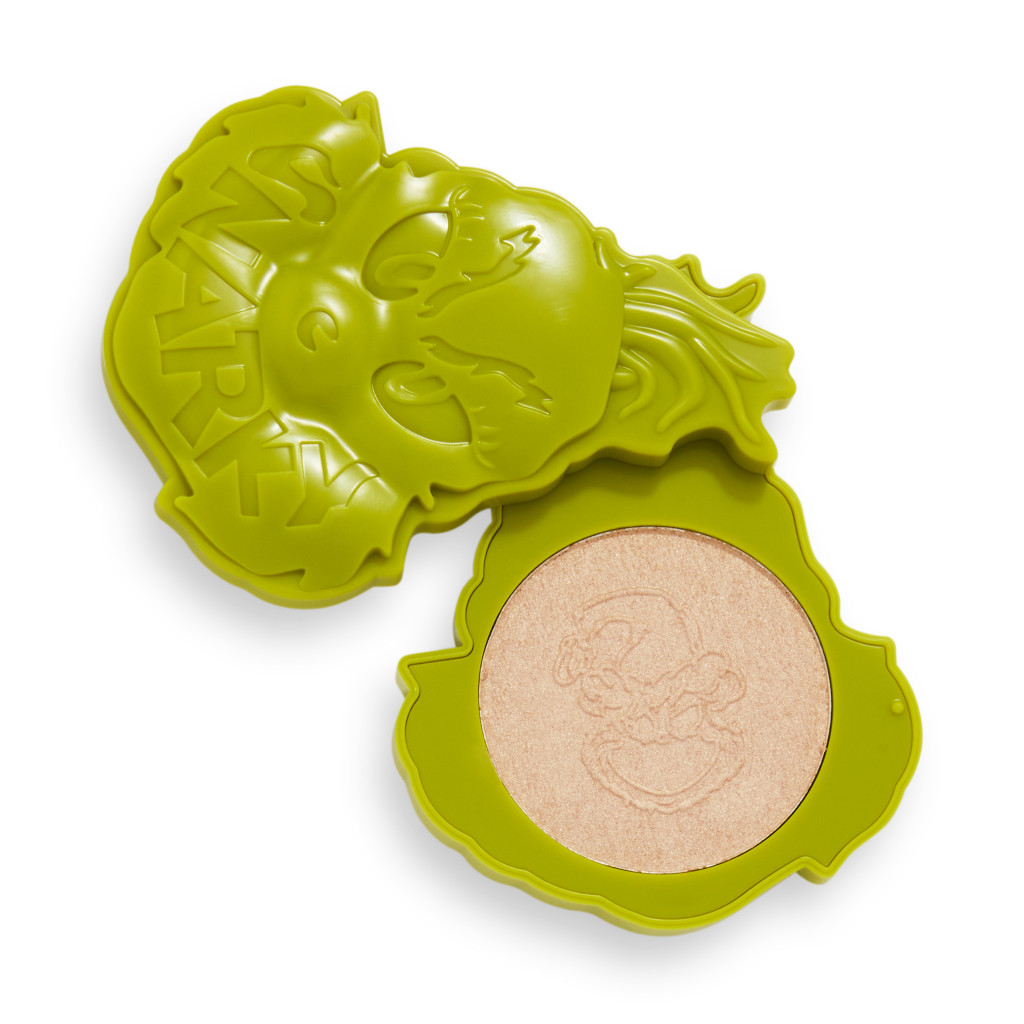 Třpytivý zlatý rozjasňovač s embosovanou hlavou Grinche je ideální k vytvoření slavnostního rozzářeného vzhledu.