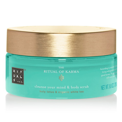 Tělový peeling The Ritual Of Karma od značky Rituals na cukrové bázi s lehkou, svěží vůní lotosu a bílého čaje revitalizuje a vyživuje pokožku celého těla.