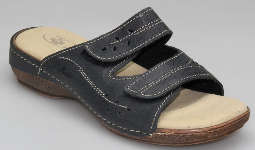 Dámská pantofel s úpravou pro hallux valgus Svrchní materiál - useň Nastavitelné pásky na suchý zip Anatomicky tvarovaná a vyměkčená stélka Barva - černá (antracit)