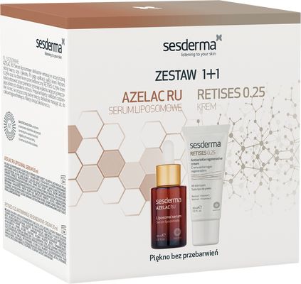 Sada obsahuje: Depigmentační sérum Azelac RU (Liposomal Serum) 30 ml Protivráskový regenerační pleťový krém Retises 0,25% (Antiwrinkle Regenerative Cream) 30 ml